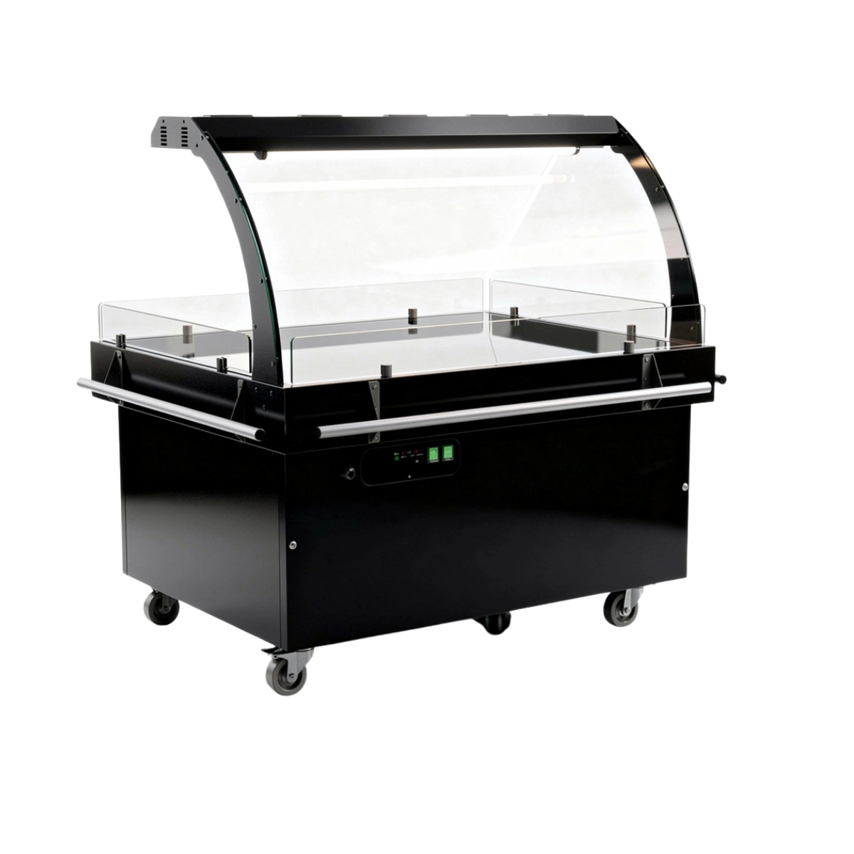 Balcão aquecido para exposição de alimentos em pontos de vendas, fabricado pela Topema com vidro térmico aquecido por resistências adesivas com controlador de temperatura digital; Tecnologia que permite regulagem da temperatura do vidro até 140ºC mantendo com precisão a temperatura de conservar e servir alimentos; Utilizado como expositor de supermercados, rotisserie, eventos e lojas de conveniência para alavancar vedas; Gabinete em chapa de aço croma cor café; Puxadores para movimentação; Suporte superior com 3 resistências cerâmicas de 300 w; Iluminação com lâmpadas alógenas de 300 w; Rodízios Ø 4” Preço de expositor direto da fábrica.